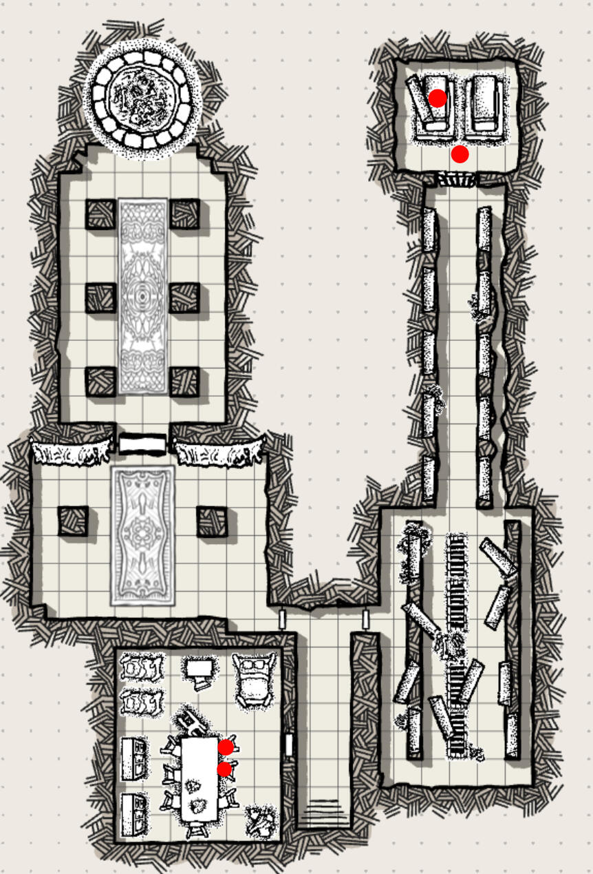 Claustrophobic corridors, a hulking undead paladin, and a possessed priest of Helm commanding it.Originally I wanted to create a scenario where the players could notice the paladin+priest duo from further away and sneak past them by hiding in tight spaces between stone walls and rows of caskets.If the player's would be seen, they'd run through the corridors trying to avoid getting cornered or halted by the paladin's command spell.Learning from our first play session and being under time- and physical constraints, I managed to create a more linear experience that would be quicker to play through, hoping we'd finish the two last dungeon levels of the one shot in one sitting.